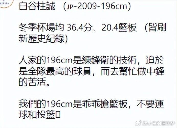 在初中时期白谷柱诚更是场均40+10,2025年已经入选日本男篮一队陪练队,上个月八村垒在日本举办的训练营白谷也是训练营MVP,很多日本球迷都期待他成为下一个八村垒,但16岁的他官方身高是1.94米,外界觉得他未来的方向更多是2-3号位,他很难长到八村垒2.03米。