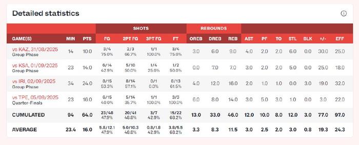 目前白谷柱诚在亚洲杯场均23.4分钟,拿到16分11.5篮板3助攻3抢断0.8盖帽,命中率47.9%,三分命中率42.9%,他的防守能力给人印象也很深刻。