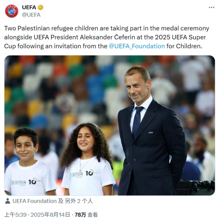 赛事主办方通过社交媒体强调:"乌迪内球场传递的讯息清晰有力,一条横幅代表千万人的心声。"虽然标语未指明具体对象,但欧足联特别邀请两名巴勒斯坦难民儿童参与颁奖环节的举动,传递出明确的人道主义立场。