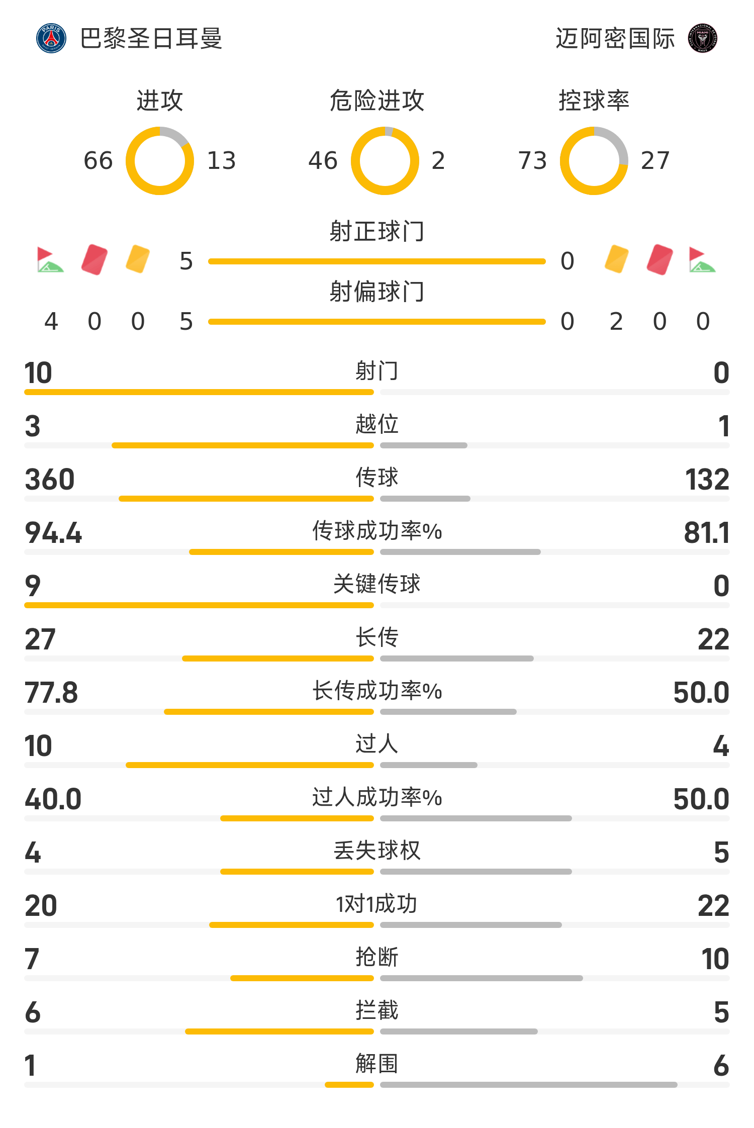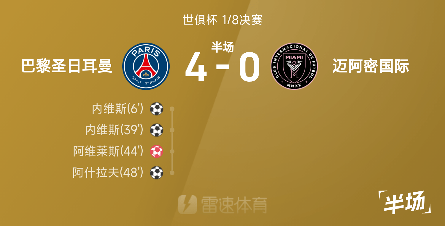 06月30日讯 25赛季世俱杯1/8决赛,巴黎圣日耳曼迎战迈阿密国际。半场战罢,双方比分暂为巴黎圣日耳曼4-0迈阿密国际,内维斯上演梅开二度,阿维莱斯自摆乌龙,阿什拉夫补射建功。