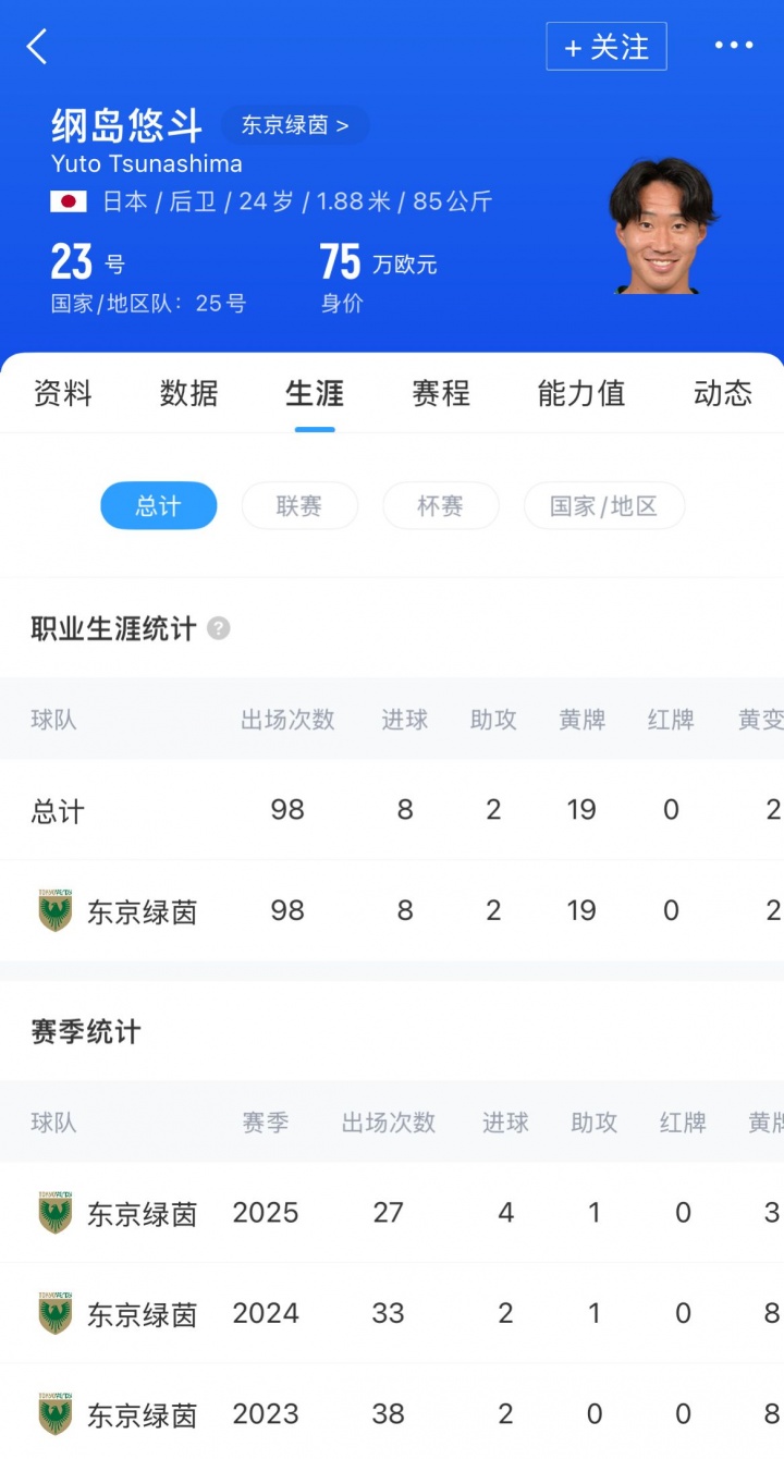 纲岛悠斗身高1米88,惯用右脚,目前是东京绿茵的主力球员,他已经代表东京绿茵出战三个赛季,98场贡献了8粒进球。据悉,他已经与安特卫普签约,很快就将开启比甲留洋生涯。他将与安特卫普阵中的日本门将野泽大志相聚。